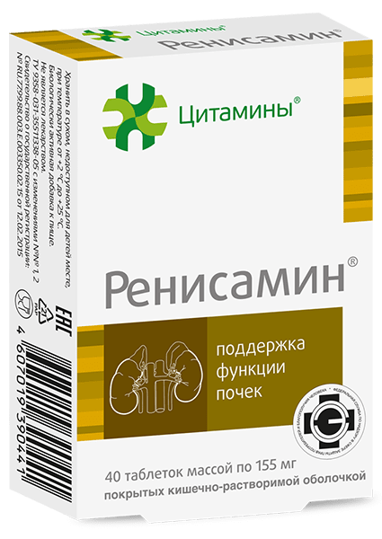 Активное вещество: 1 таблетка содержит: ренисамин порошок*-10 мг. * комплекс полипептидов и нуклеиновых кислот, полученный из ткани почек крупного рогатого скота. Вспомогательные вещества: Лактоза (наполнитель), сахар-песок (загуститель), крахмал картофельный (разрыхлитель), кальция стеарат (агент антислеживающий), дисперсия сополимера метакриловой кислоты (кишечнорастворимое покрытие), пропиленгликоль (эмульгатор).